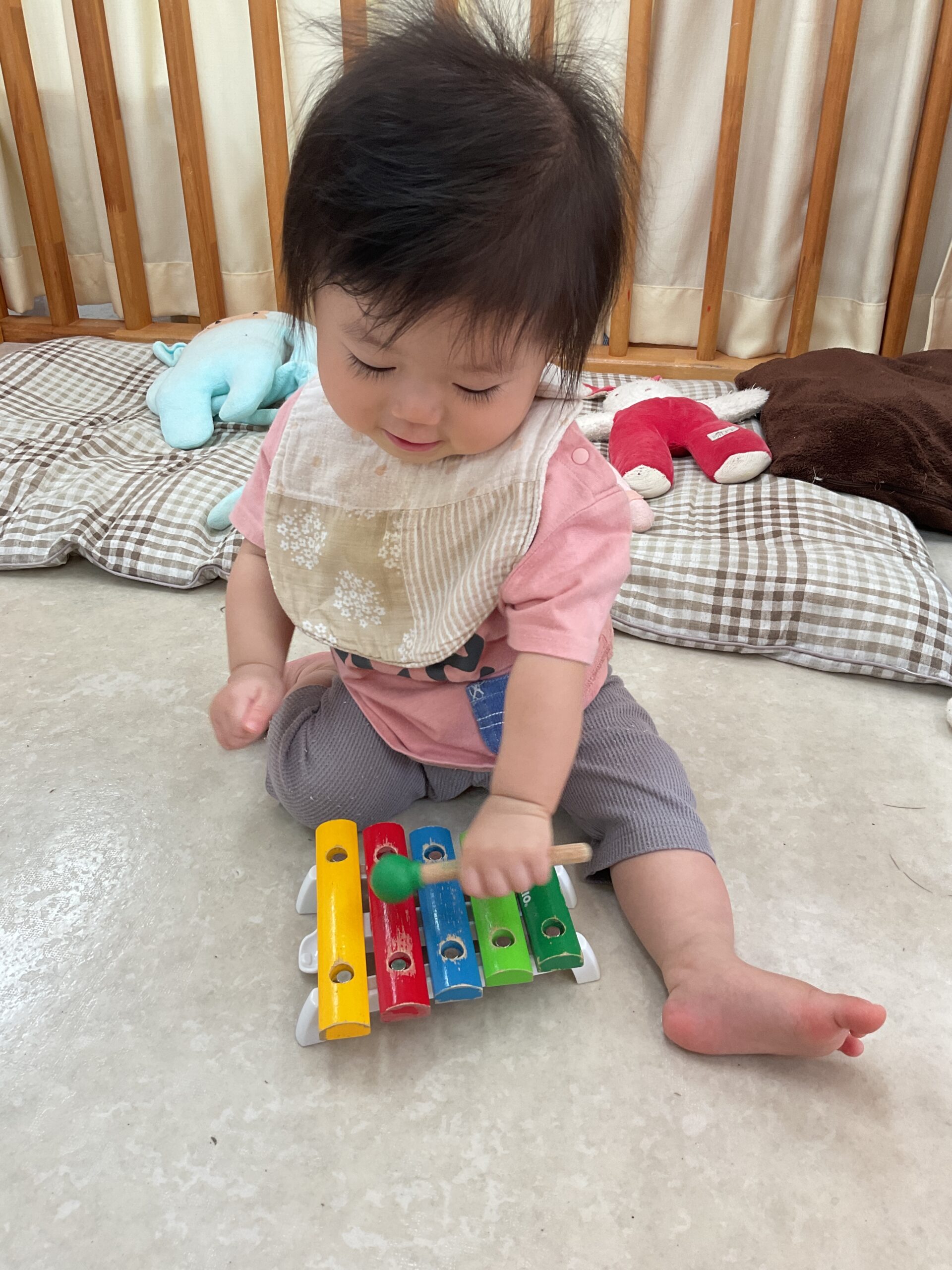 今月も様々な遊びの様子を紹介します。 大きさが5種類ある重ねカップを、重ねたり、裏返しにして積んだりと、いろいろな遊び方を試しています。 小さいカップに大きいものを重ねてカップが見えなくな…
