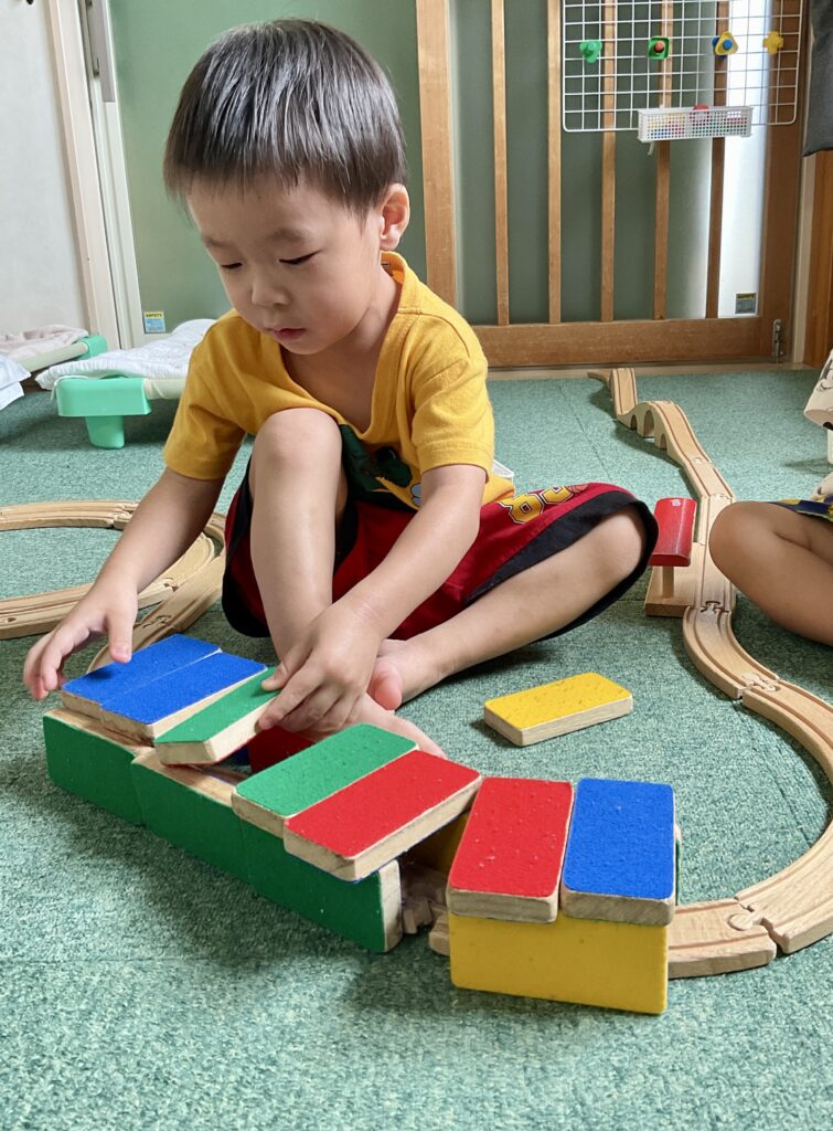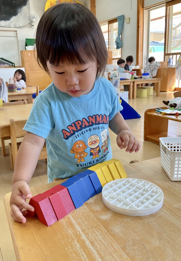 早速カゴから出し積み木を並べる時には、色と向きを揃えるところが印象的でした。