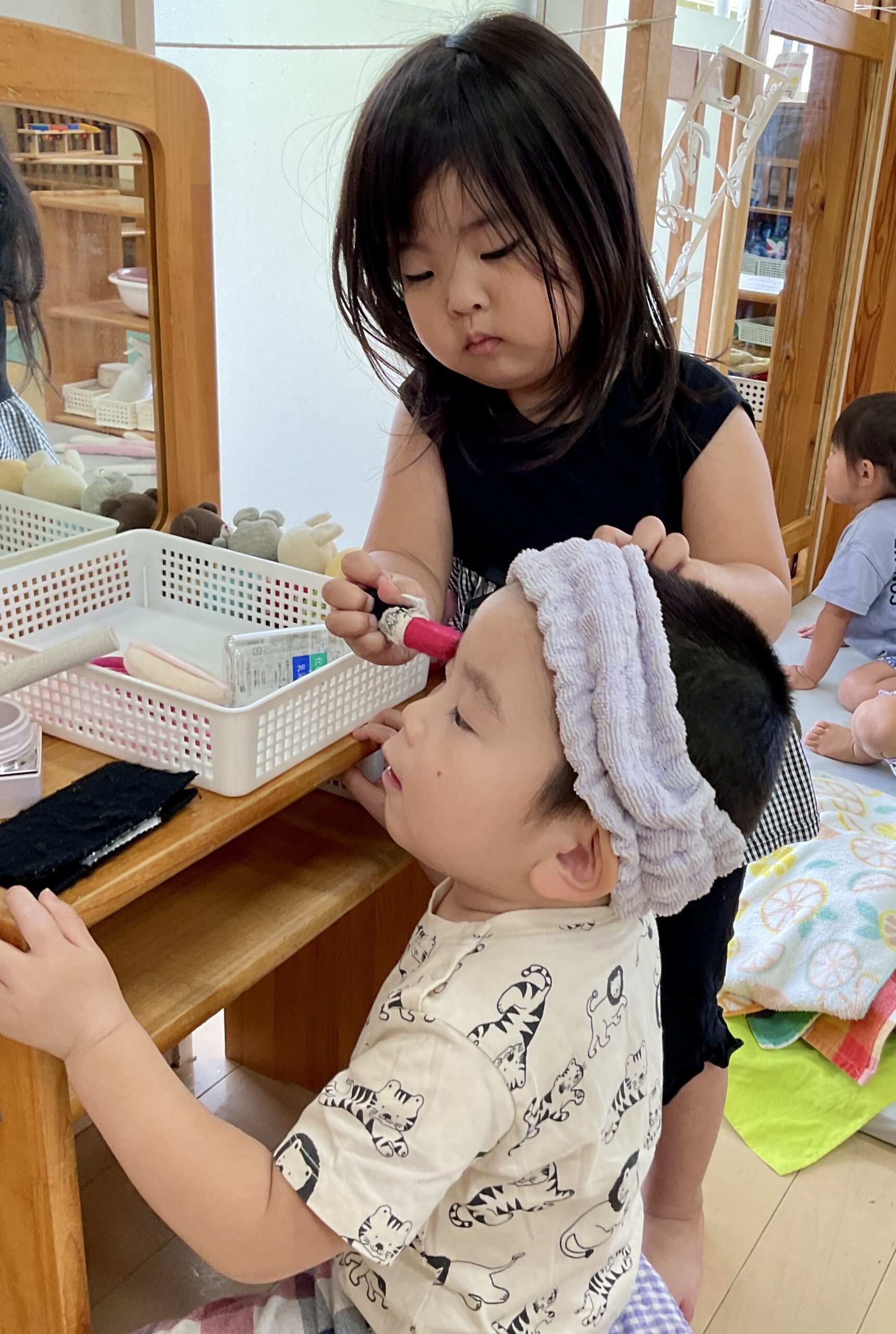口紅やアイシャドウを顔のあらゆるパーツに何度も重ねて塗り、座っているお子さんが席を立とうとすると、「ここ、ここ」とまるでまだメイクが終わっていないことを伝えているようでした。