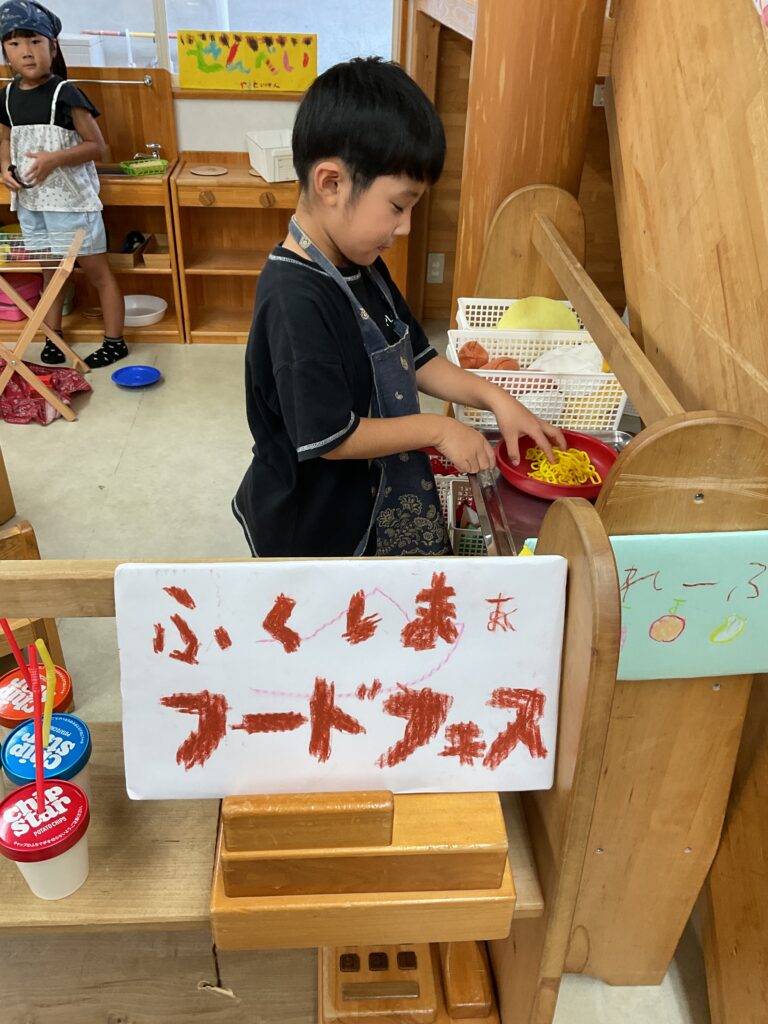 にじ組とあさひ組の子どもたちがお店屋さんの中心に、やまびこ組の子どもたちがお客さんとなって、フードフェスごっこが盛り上がっていました。