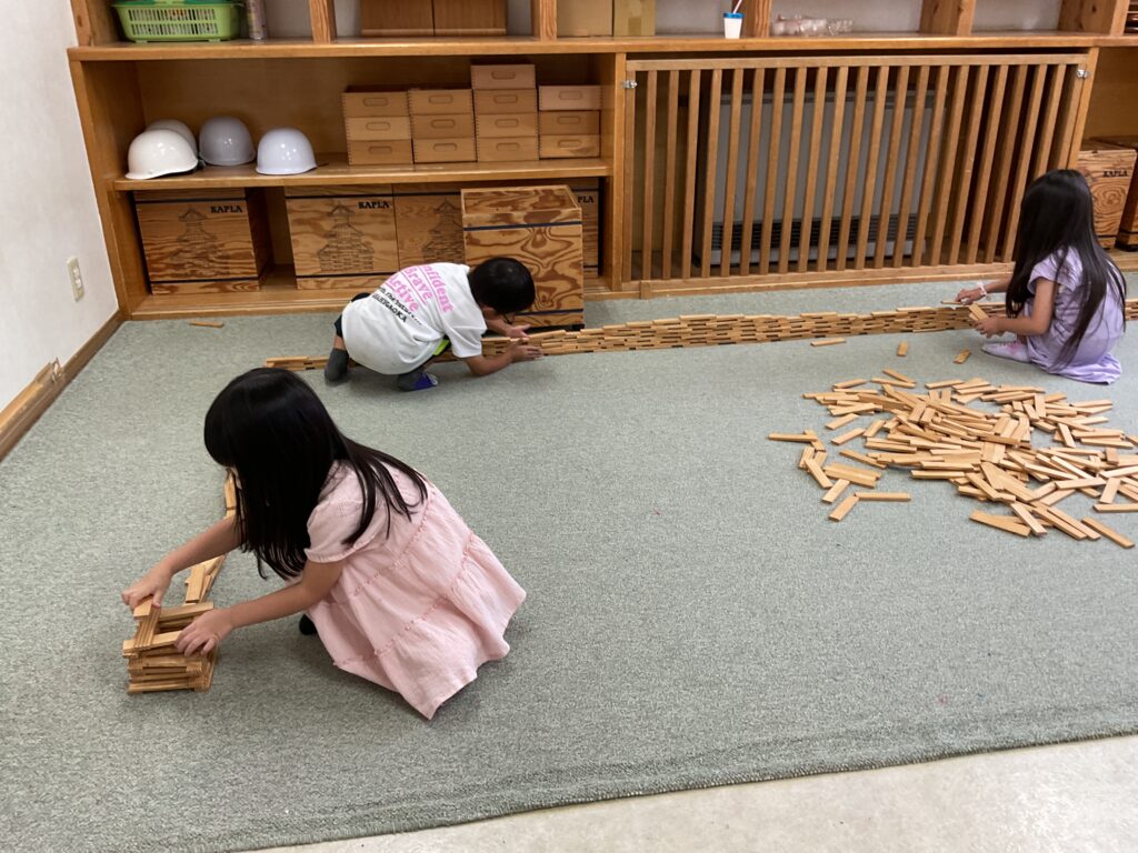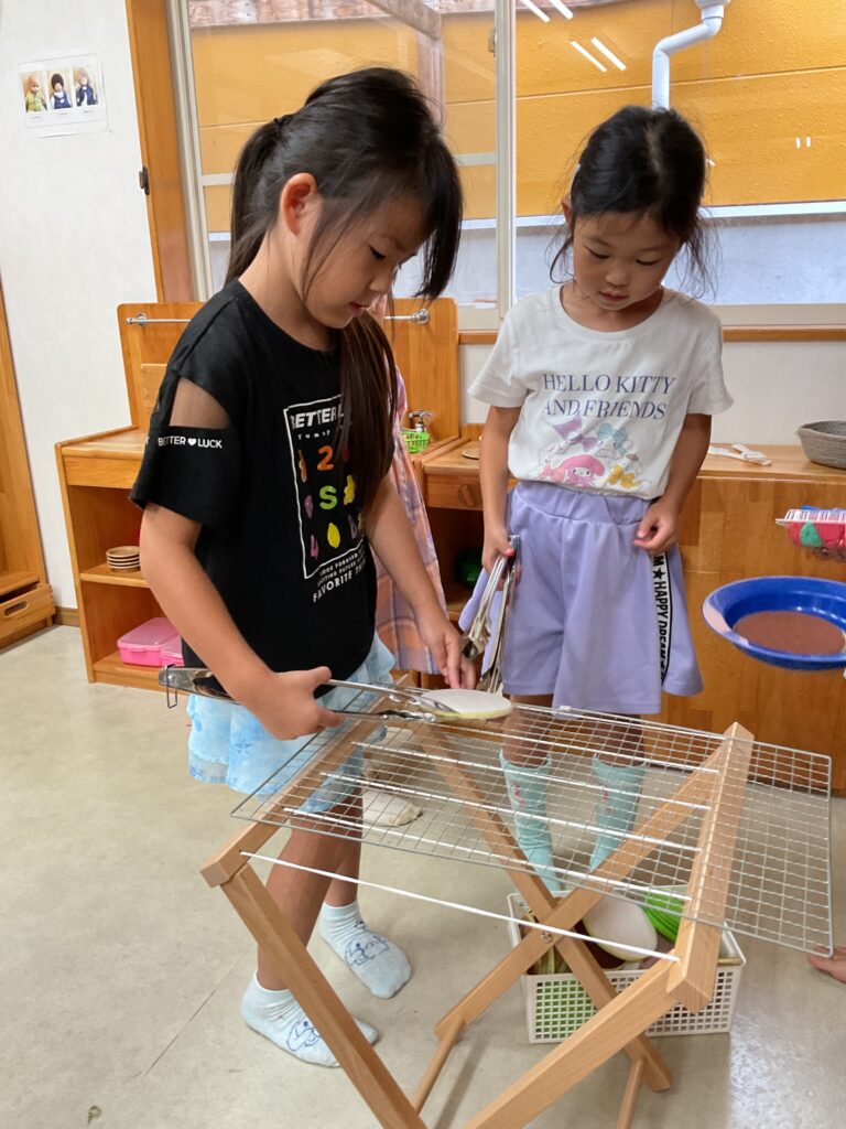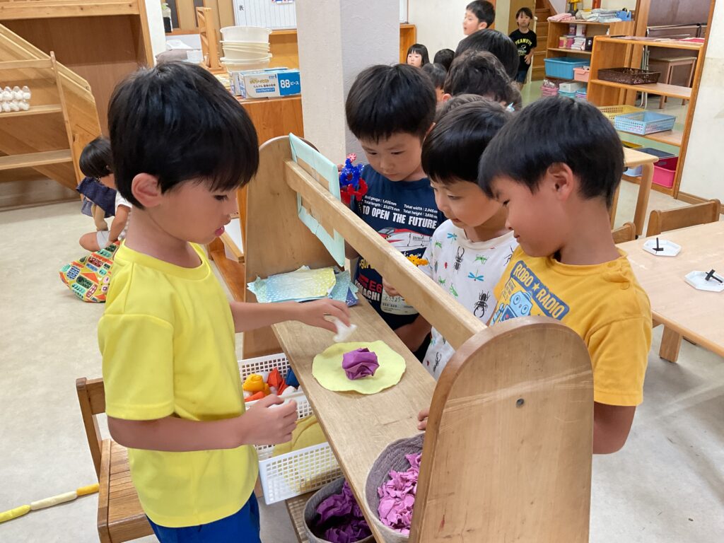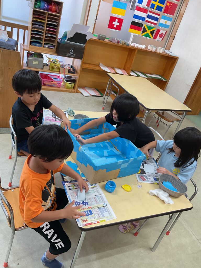 こちらは、桃すくいで使うプールを作っているところです。「こんな形だったよね?」「ここは透明じゃない?」と実際に体験し、見てきた物を思い出しながら作っていました。