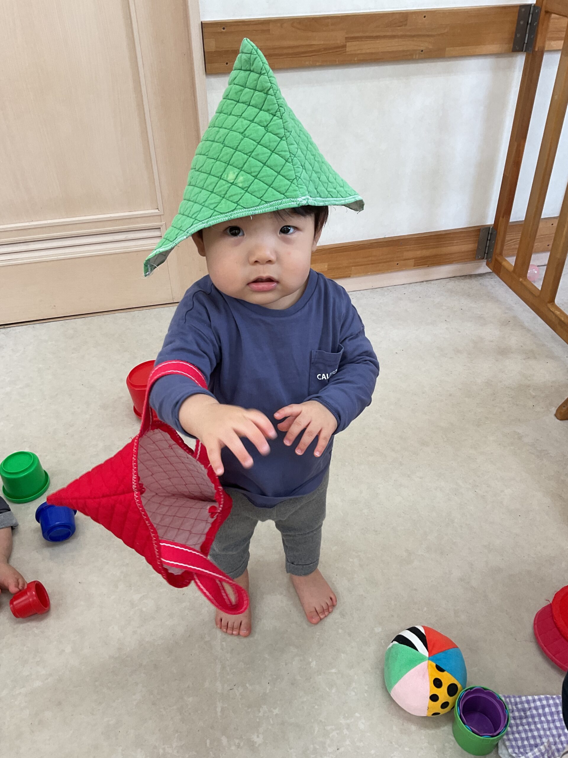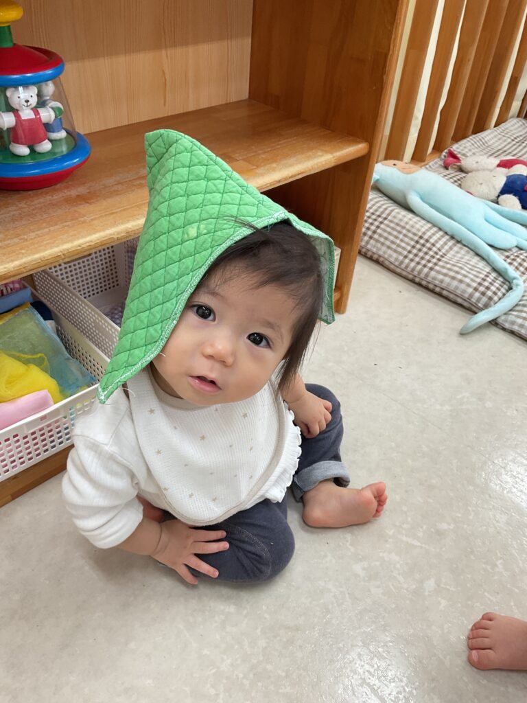 着脱にも意欲的になっているので、遊びの中で帽子を被る、靴下を履くなど、着脱の動きもできる環境を整えています。