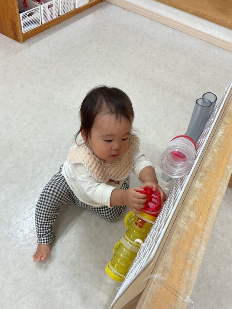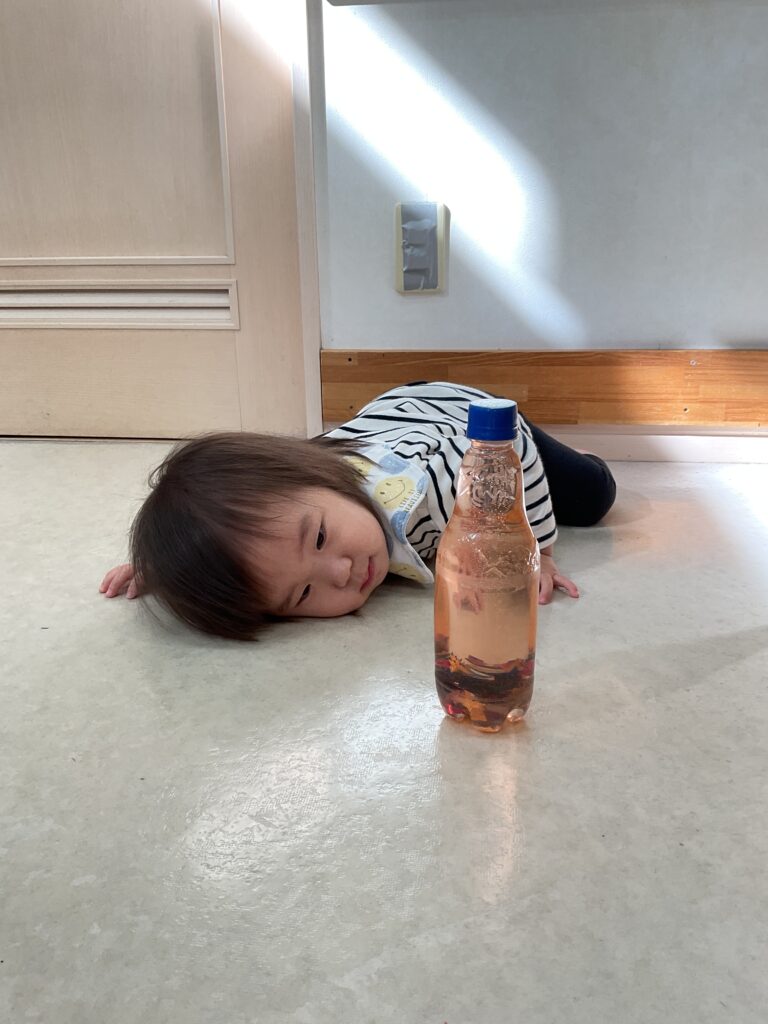 保育室に陽が入ると、水やビーズの色合いも違ってみえていたので、顔を傾け、見る角度も変えながらボトルを覗き込む姿が見られました。