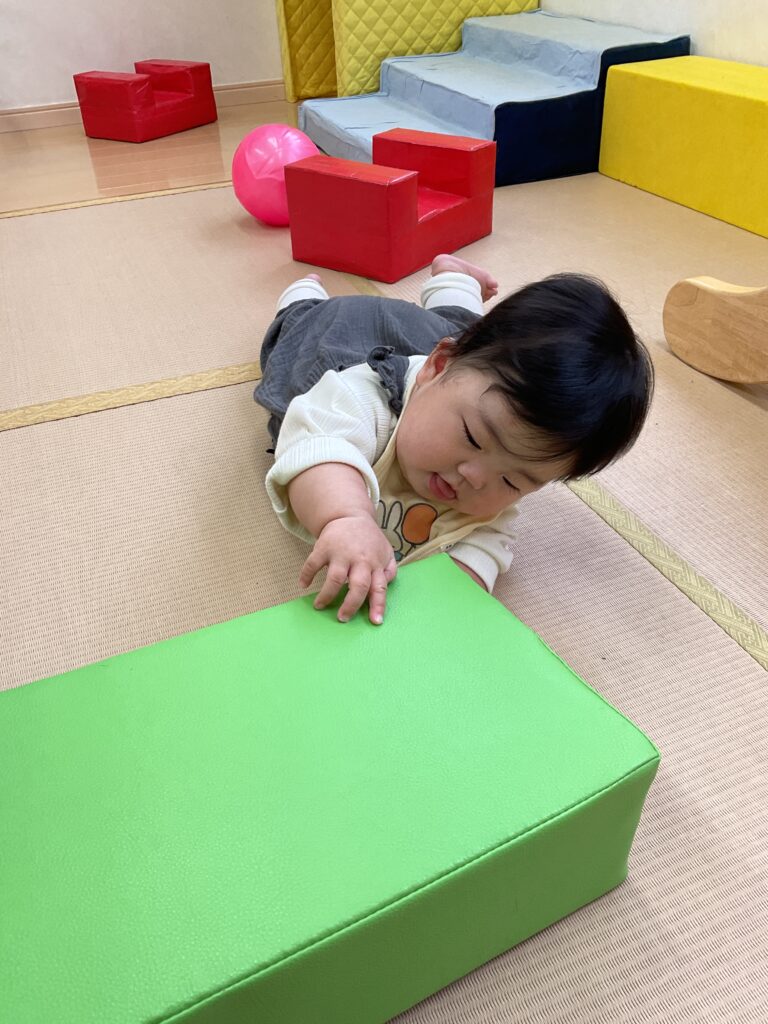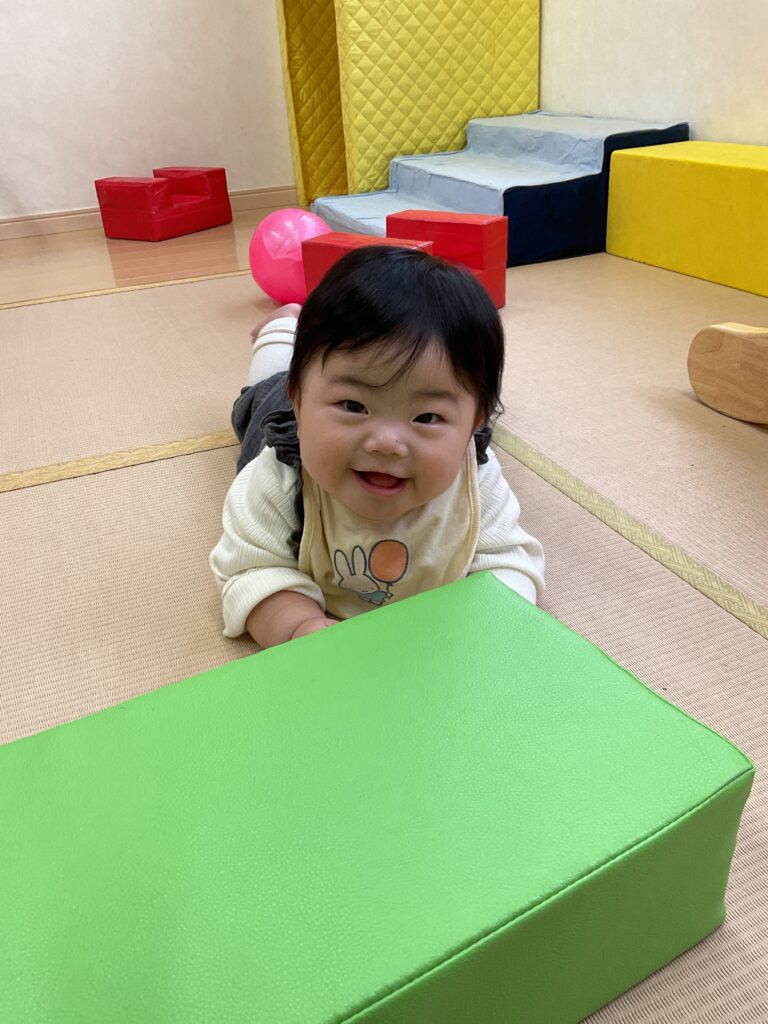 写真は保育士の「前に進めたね」「手が届いたね。クッションやわらかいね」との声かけに表情で応答している姿です。