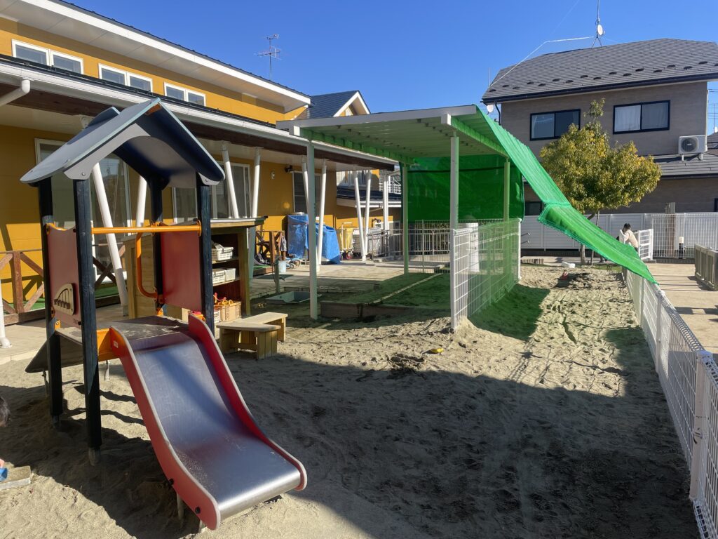 先月からの園庭改修工事が終わり、園庭の砂場スペースが広くなりました。