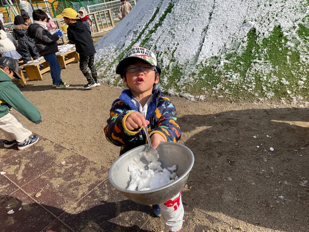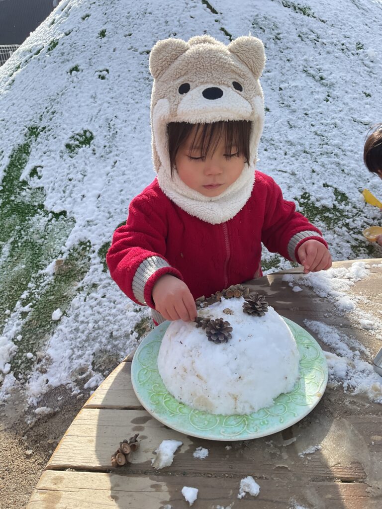 ボウルに入れ固めた雪をひっくり返すとホールケーキのような形をしているので、その上に飾りつけをするお子さんもいました。