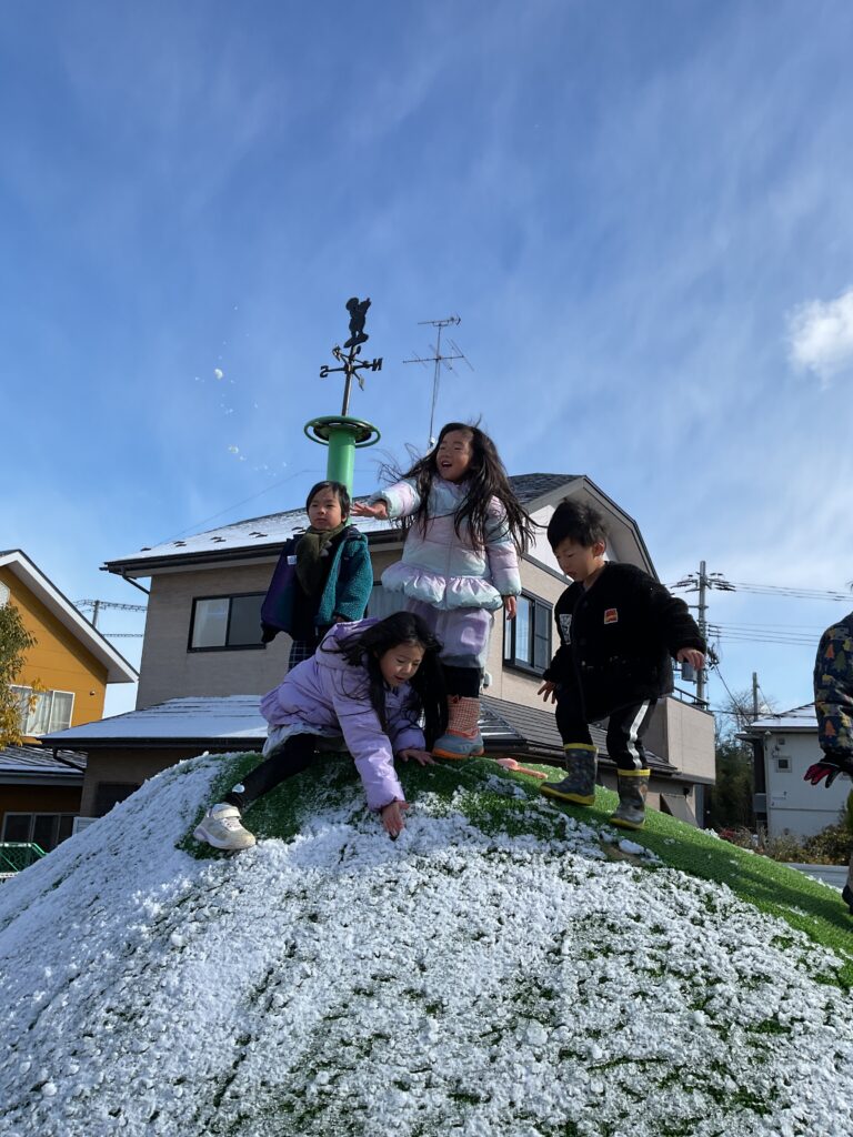 築山に積もった雪は滑りやすく、山の上まで登るのも一苦労です。