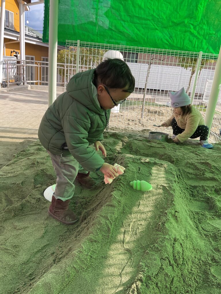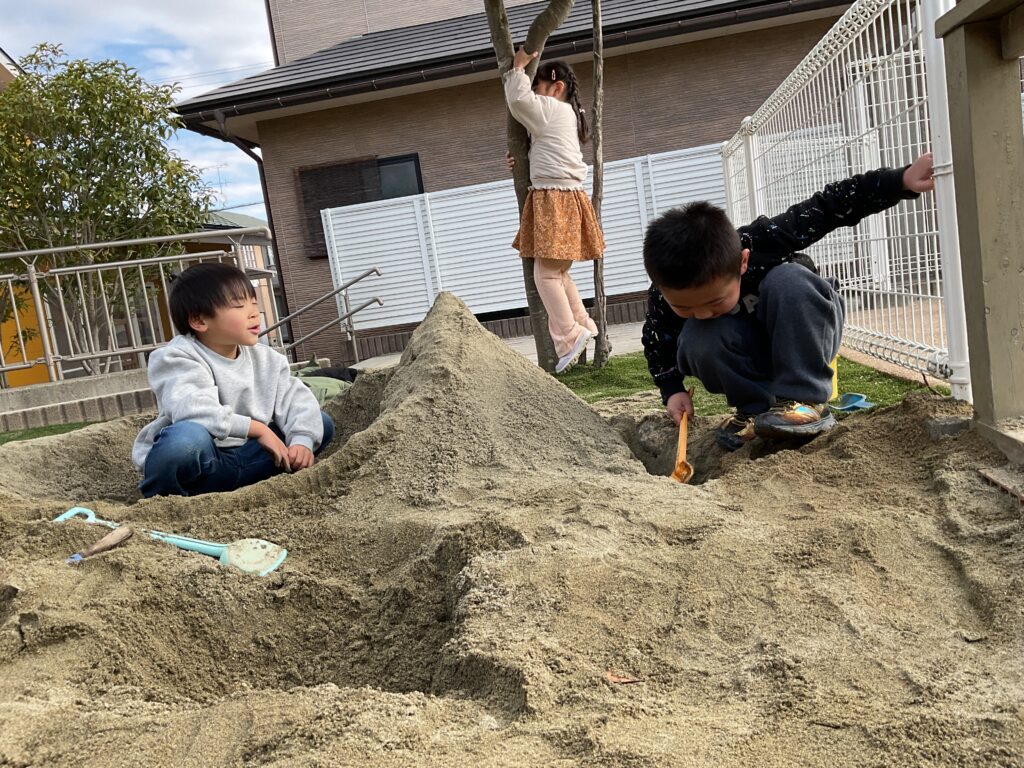 新しい砂がまだふかふかで、まるで雪の上を歩いているような状態なのですが、その感触が楽しいようで、あえて砂の上で鬼ごっこをする「砂場鬼ごっこ」というのを考えて遊んでいる子どももいました。