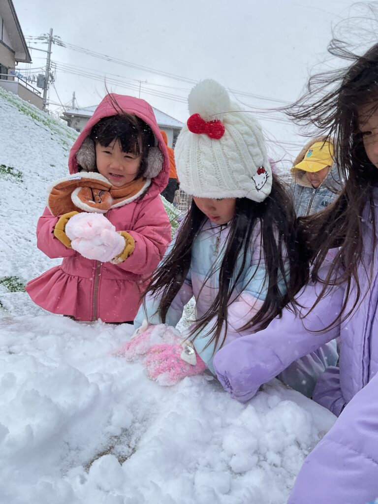 「せんせい見て!こんなにあったよ!」と雪をたくさん集めたことを伝えています。