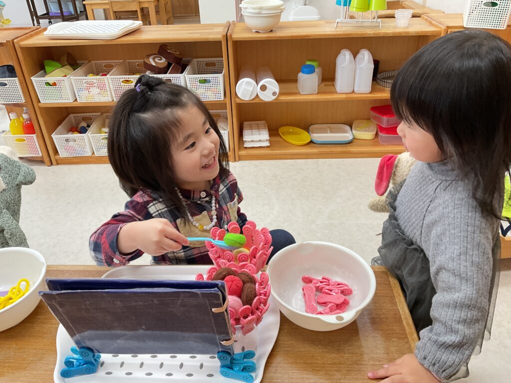 一方、保育室のおままごとコーナーでは、パフェのメニュー表を真似てバフェ作りをしていました。