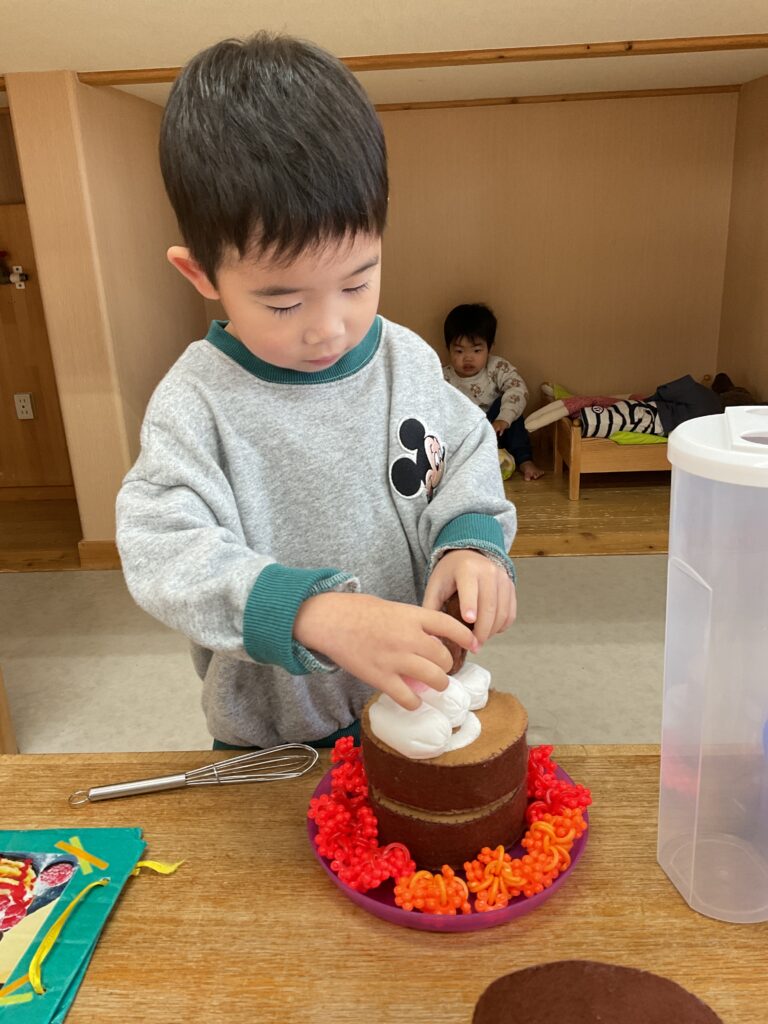 ロールケーキの素材をパンケーキに見立て、お手玉や花はじきを使ってデコレーションしていました。
