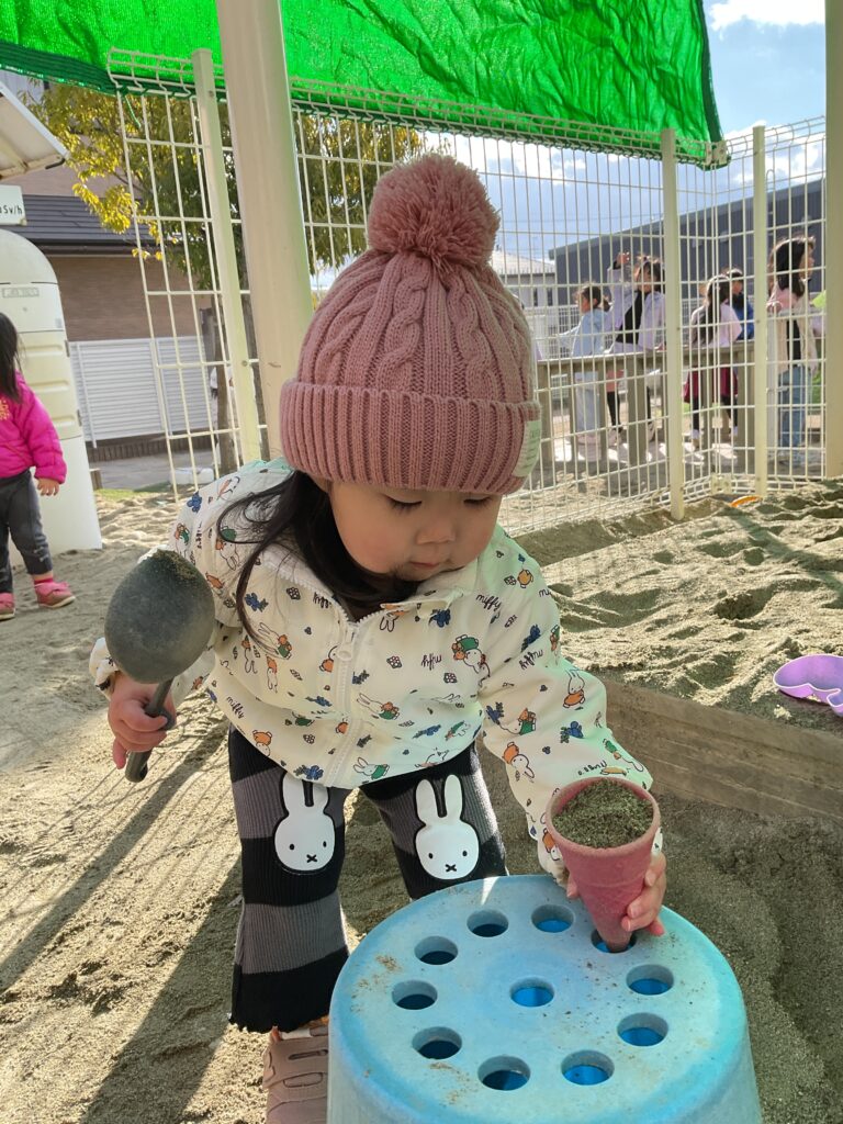 砂場遊びでは、アイスコーンの玩具に砂を入れ、カラーバケツに「アイス!アイス!」と言いながら立てていました。