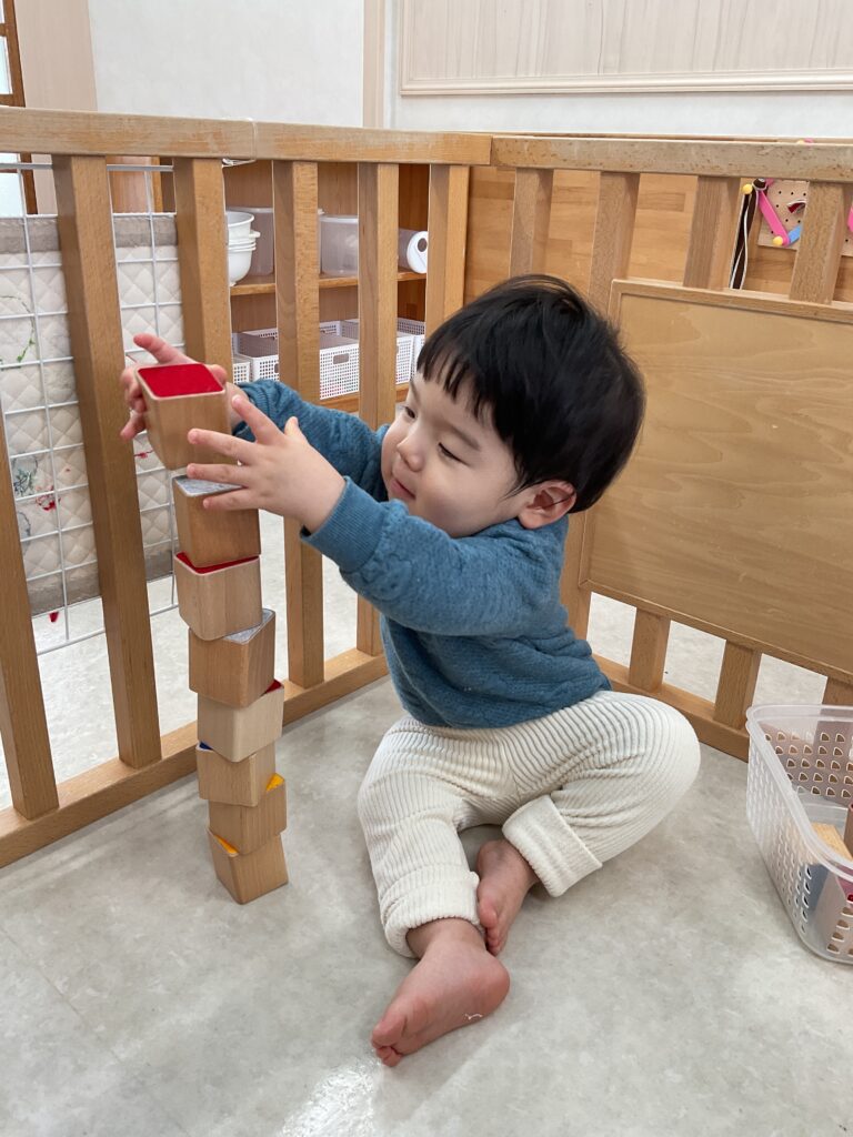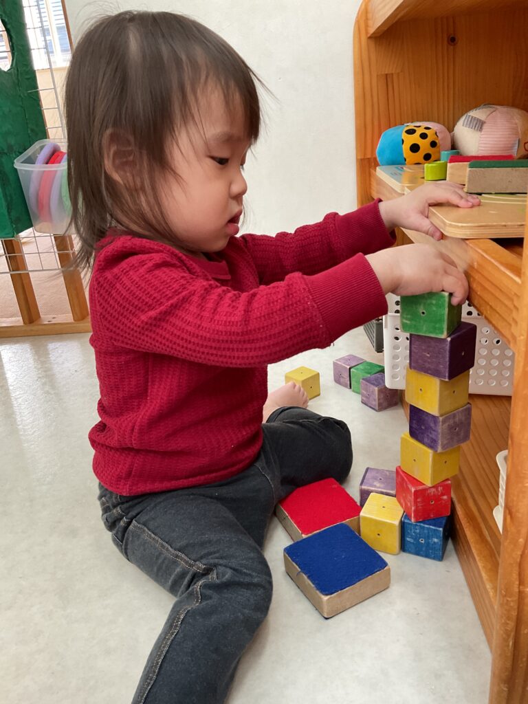 積み木では、高く積もうとする姿が見られ始め、途中で崩れることがあっても、何度も挑戦しています。