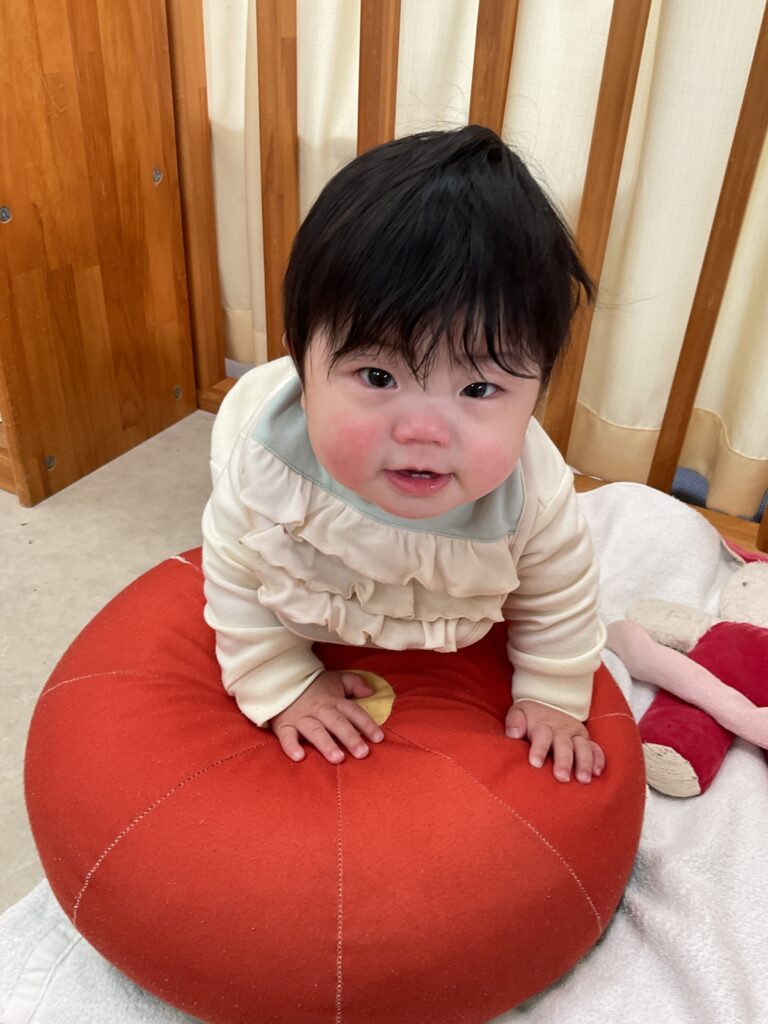 保育者が「たくさん足動かせたね」と話しかけると、片手を大きく上げて反応していました。