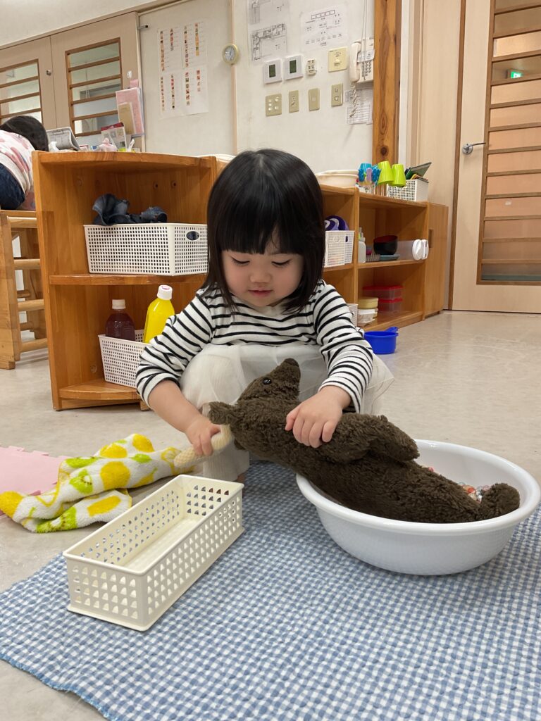 お風呂に見立てた洗面器にメルさん(クマの人形)を入れ、スポンジで体を洗います。