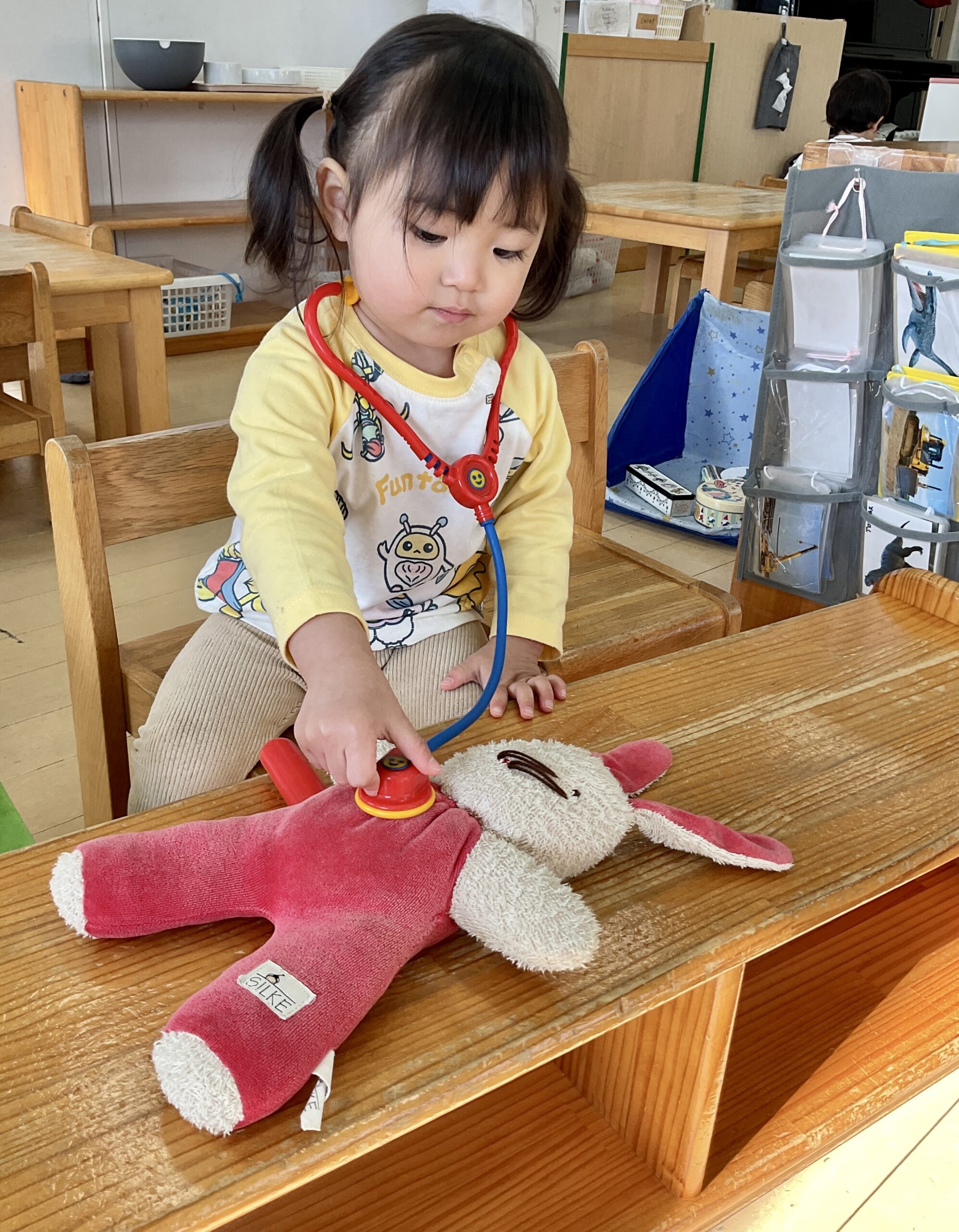 今月も保育室の遊びをご紹介します。 12月初旬保育室に、クリスマスツリーやリース、サンタや雪だるまを飾りつけました。 飾りに気づき、「あ、サンタさんいるよ」「キラキラきれいだね」と、子ども同士、保育者とやりとりを交わして […]